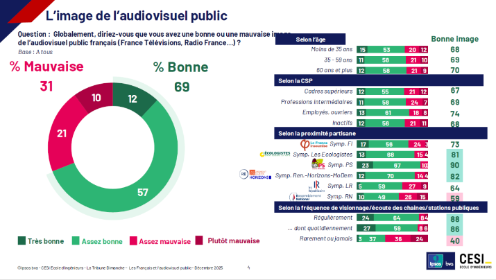 Source : Rapport « Les Français et l’audiovisuel public » Ipsos bva – CESI Ecole d’ingénieurs pour La Tribune Dimanche / Décembre 2025